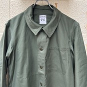 フランスらしい丸襟のワークジャケットで、ディテールはシンプルではありますが、フレンチミリタリーワークジャケットの中でも出数の少ないオリーブカラーです。 非常に高密度に織り込まれたコットンツイルが使用されたタフな素材感。味のあるこなれた風合いと色味も良い雰囲気です。ユーロワーク特有のシンプルで洗練されたディテールやデザインも合わせやすく、肩肘張らず幅広いボトムスとコーディネートして頂けます。一重の作りですので、アウター感覚で、シャツ感覚で、ロングシーズン活躍してくれるのではないでしょうか。流行に左右されないクラシカルな一着に拘りたい方はぜひこの機会に如何でしょうか。