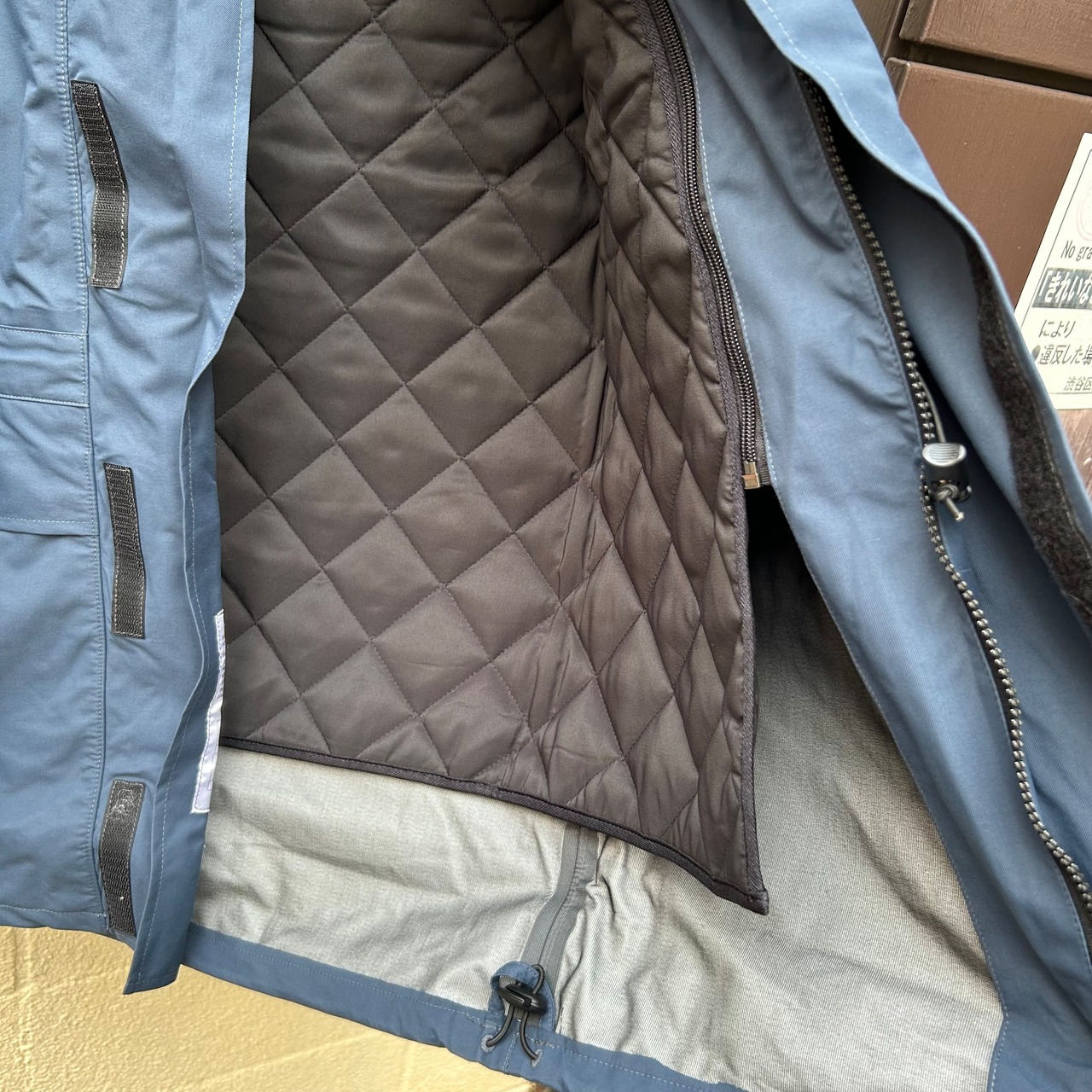 コーデに取り入れやすい落ち着きのあるブルーカラー。ジッパーでスムーズに着脱可能なキルティングライナーが付属し、幅広いシーズンに対応してくれるのもポイントです。袖口は調節可能なベルクロクロージャー、ウエストには調整可能なドローコード付きで雨風の侵入を防ぎ、プロテクション効果をより高める仕様。絶妙な高さのスタンドカラーにフロントは使い勝手の良い比翼付きのダブルジップ仕様です。