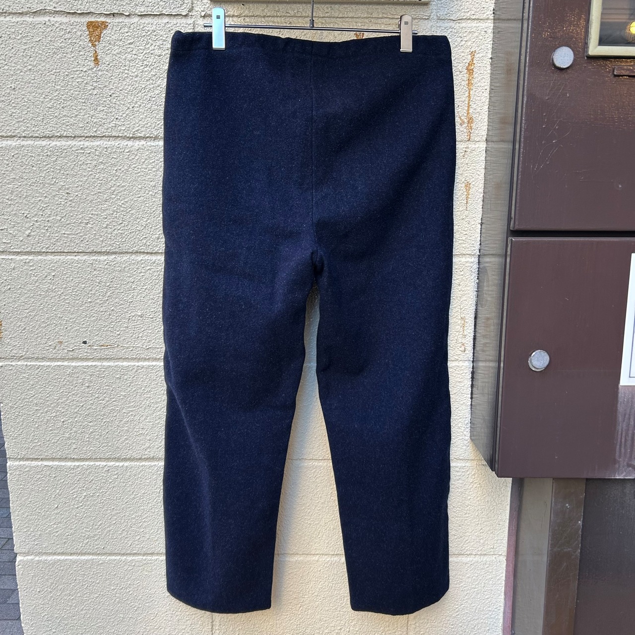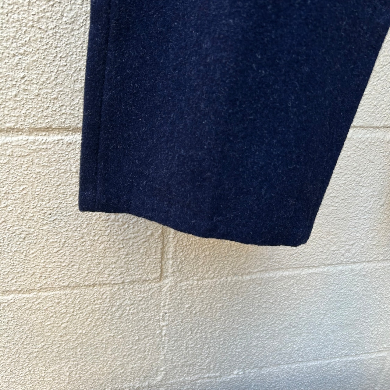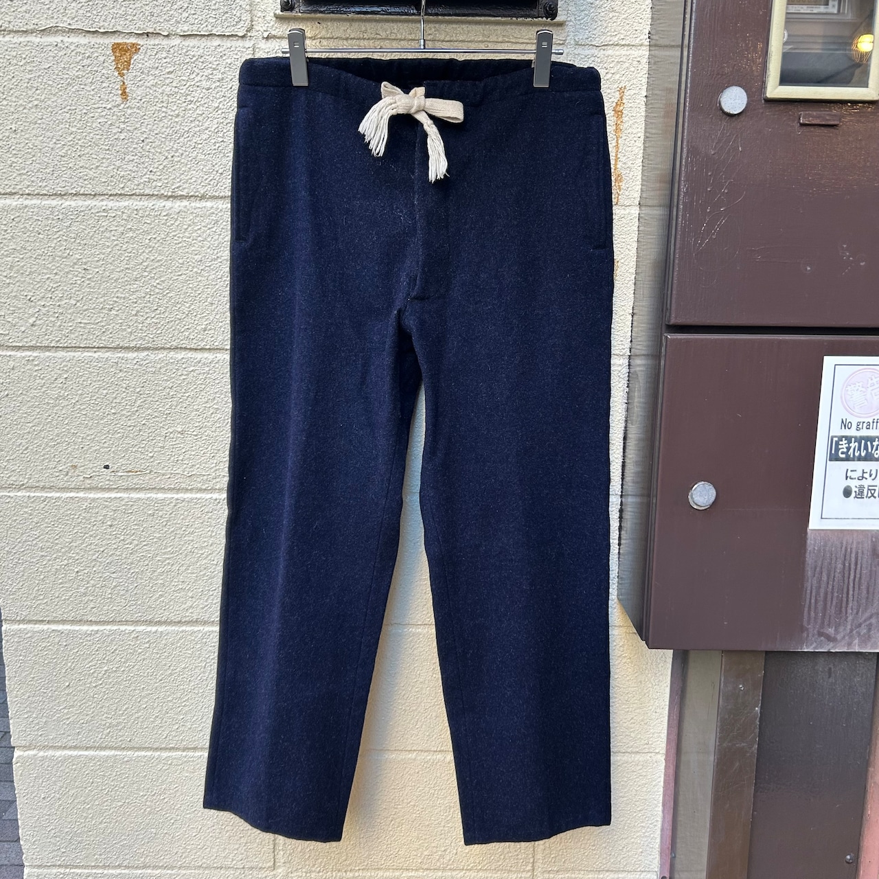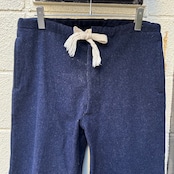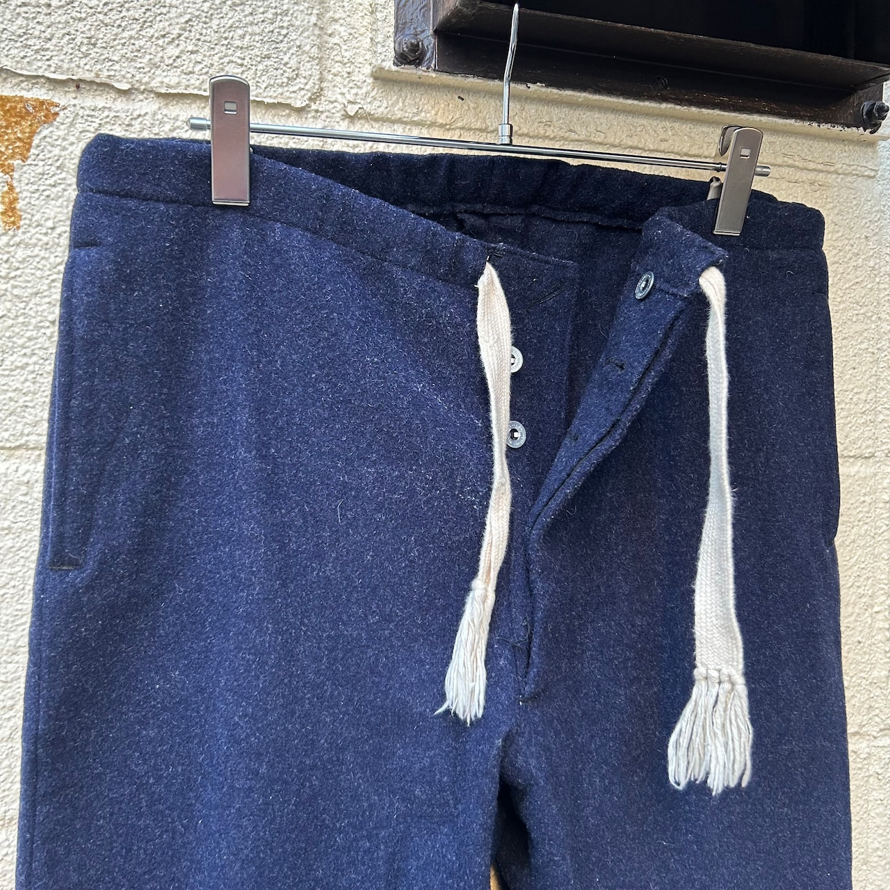 深いネイビーカラーの厚手のウール地に、ホワイトコットンのドローコードが付いたデザインです。