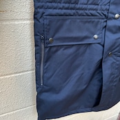 表地には耐久性の高いポリエステル素材を使用し、表地の裏側はポリウレタンコーティングが施されているため、雨や雪といった悪天候にも対応する防水性を確保しています。襟元には着脱可能なボアカラーが備えられており、首まわりからの冷気の侵入を防ぎます。さらに、襟の背面にはジッパー開閉式の収納フードが内蔵され、必要に応じて素早く使用できる実用的な設計です。
