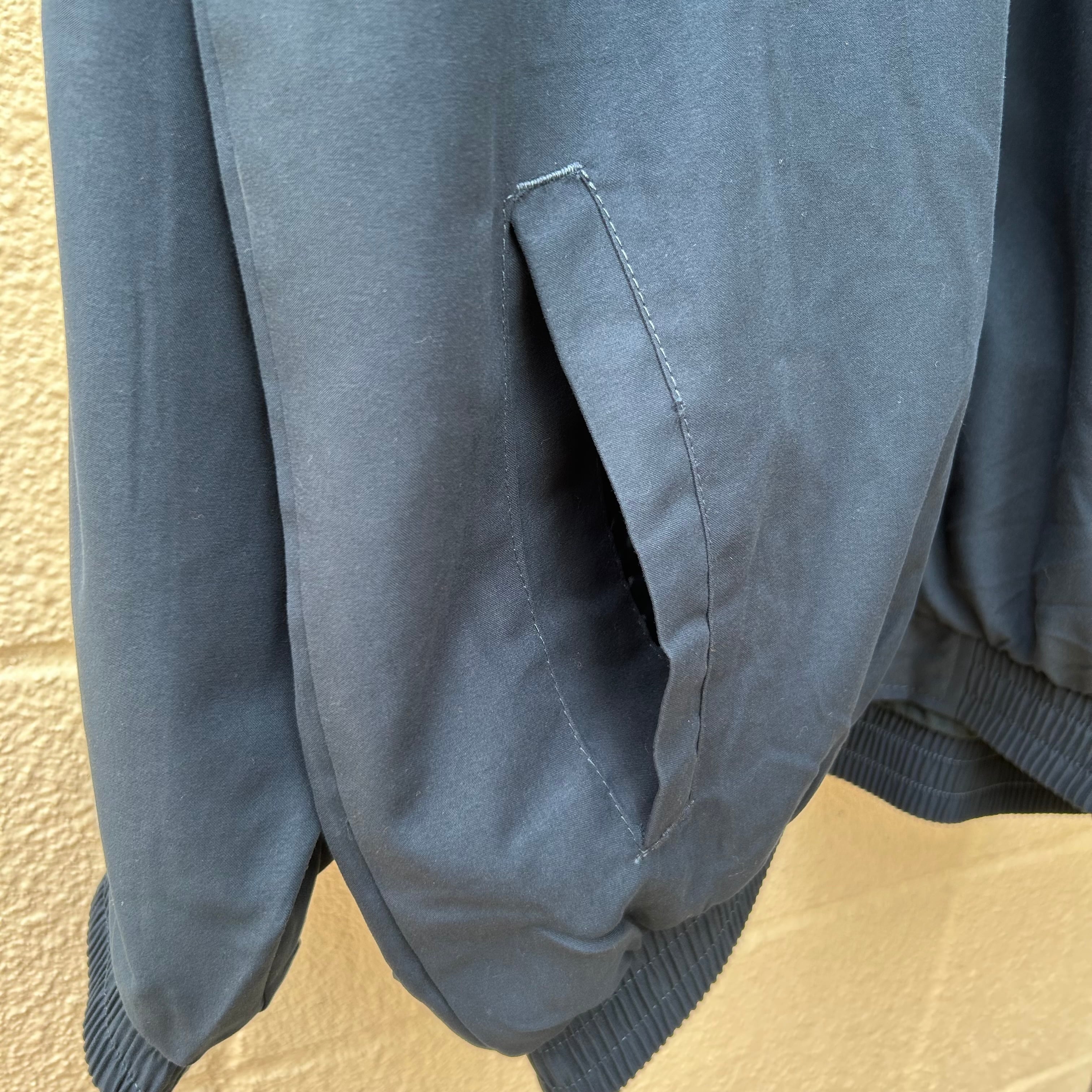フロントはジッパー開閉、袖と裾はゴム仕様で着脱、左右にシームポケットを備えています。