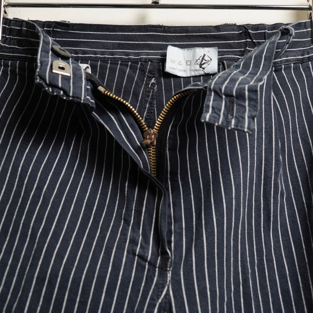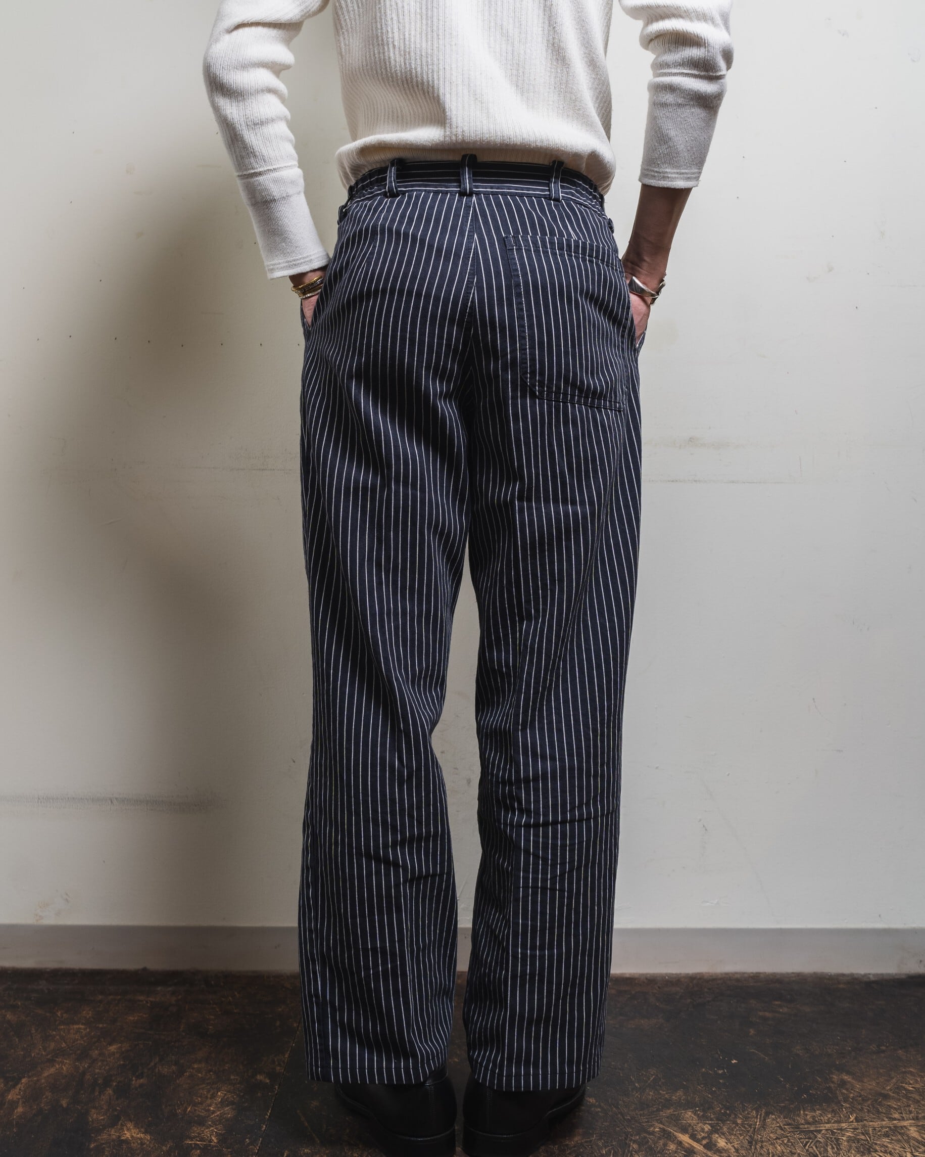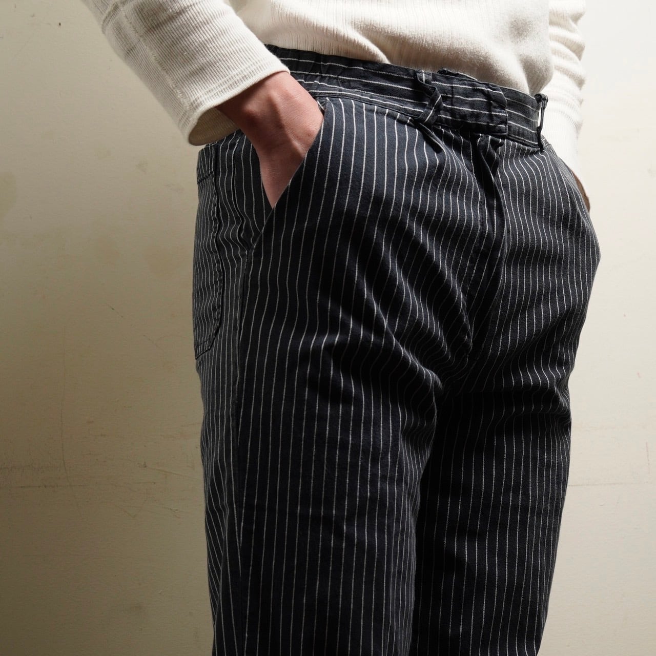 ブラックに近い深みのあるネイビーにピンストライプの大変雰囲気良いパンツ。