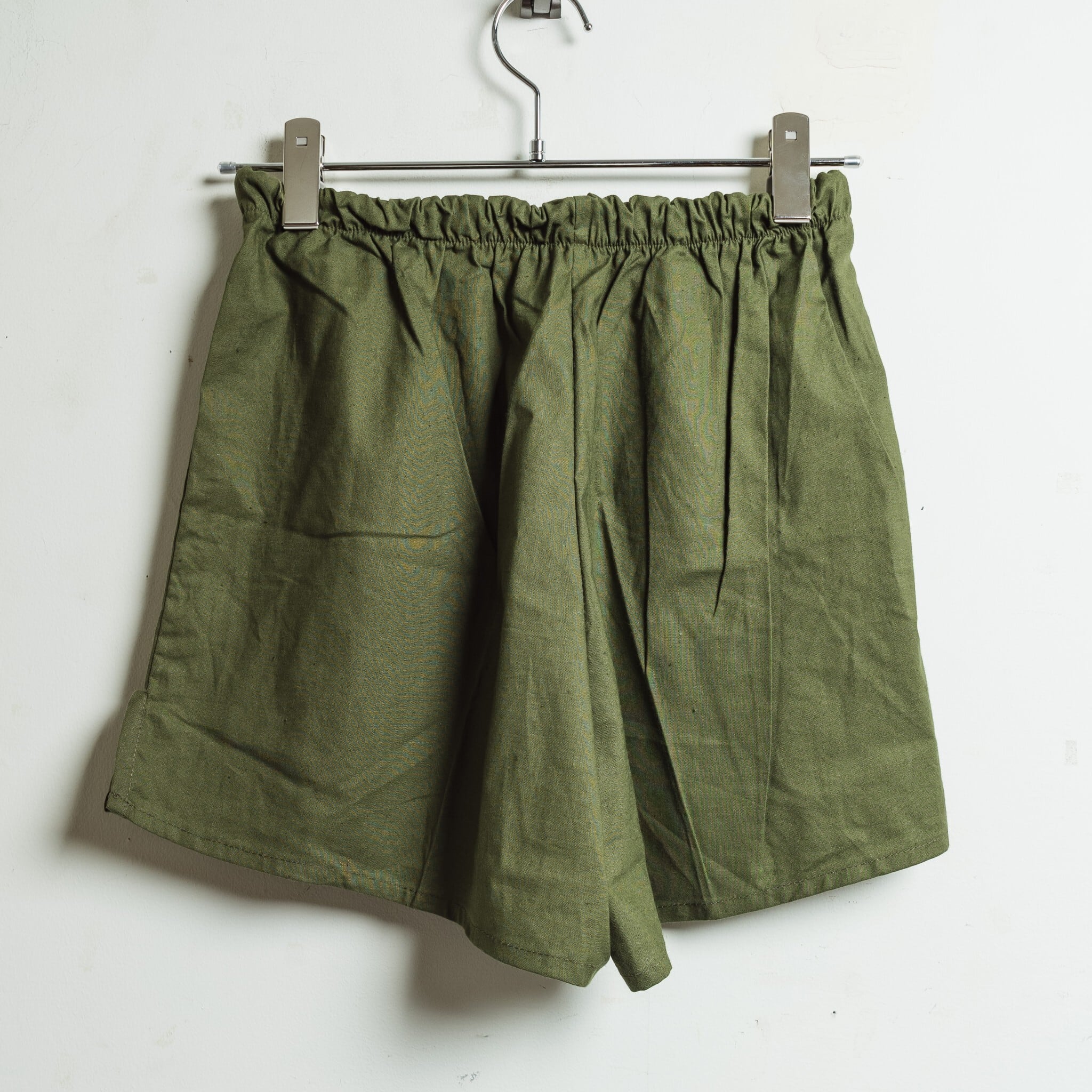 通気性の良いしっかりとした平織りのコットンが使用されたオリーブカラーのトレーニングショーツで、サイドスリットで動きやすいデザインです。