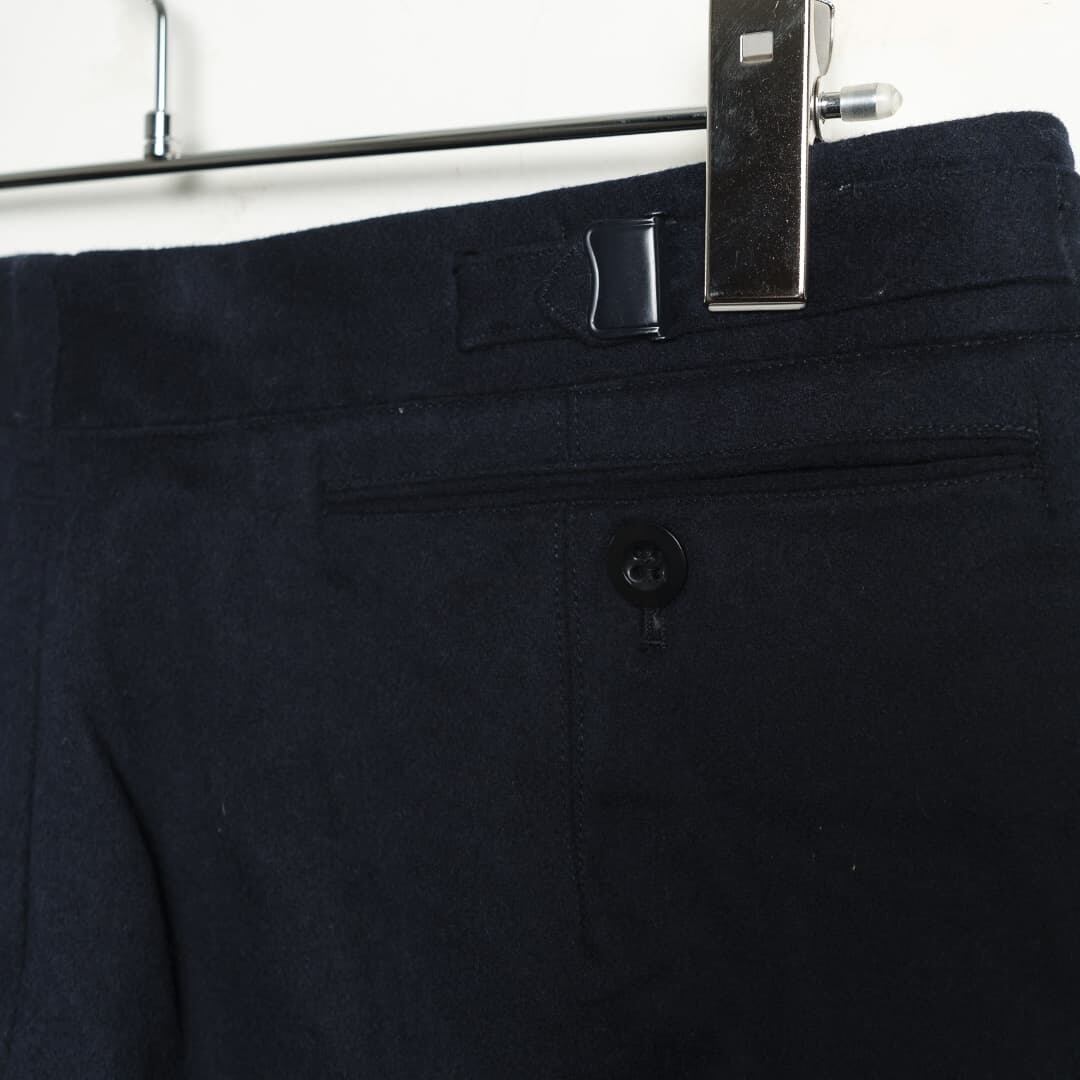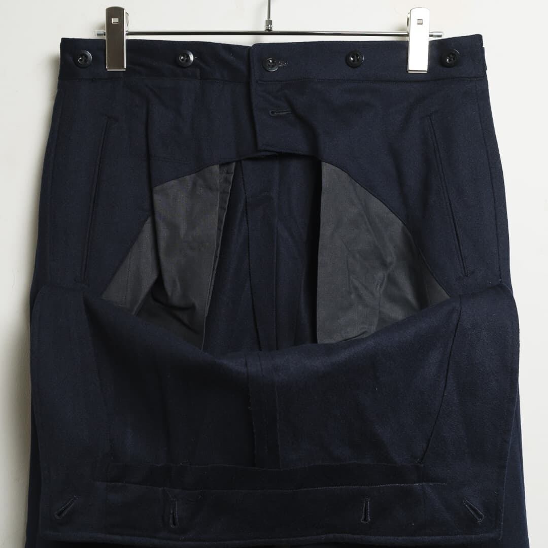60年代のフラッシャー付きドイツ軍のウールセーラーパンツ。生地は肌に直接履いてもチクチクしない厚手のメルトンウール。履いた感じはハイウエストで綺麗に履けるフレアシルエットで、ウールのセーラーパンツの中では履きやすいタイプ。また、ベループがなくサイズが大きい場合は、両サイドのアジャスターでサイズ調節可能です。