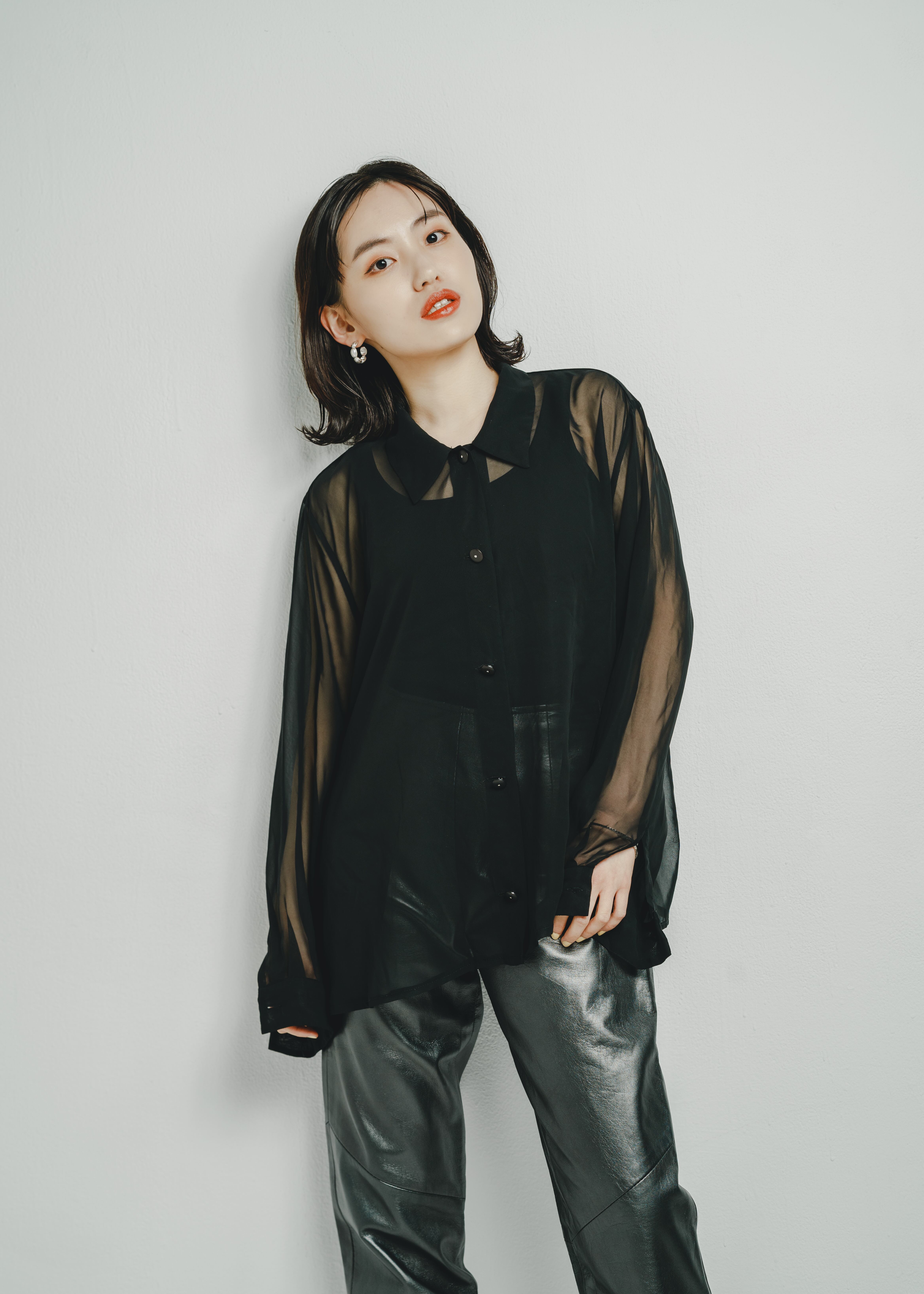 ブラックシアーブラウスなどの透け感のあるトップスとのスタイリングがおすすめです。