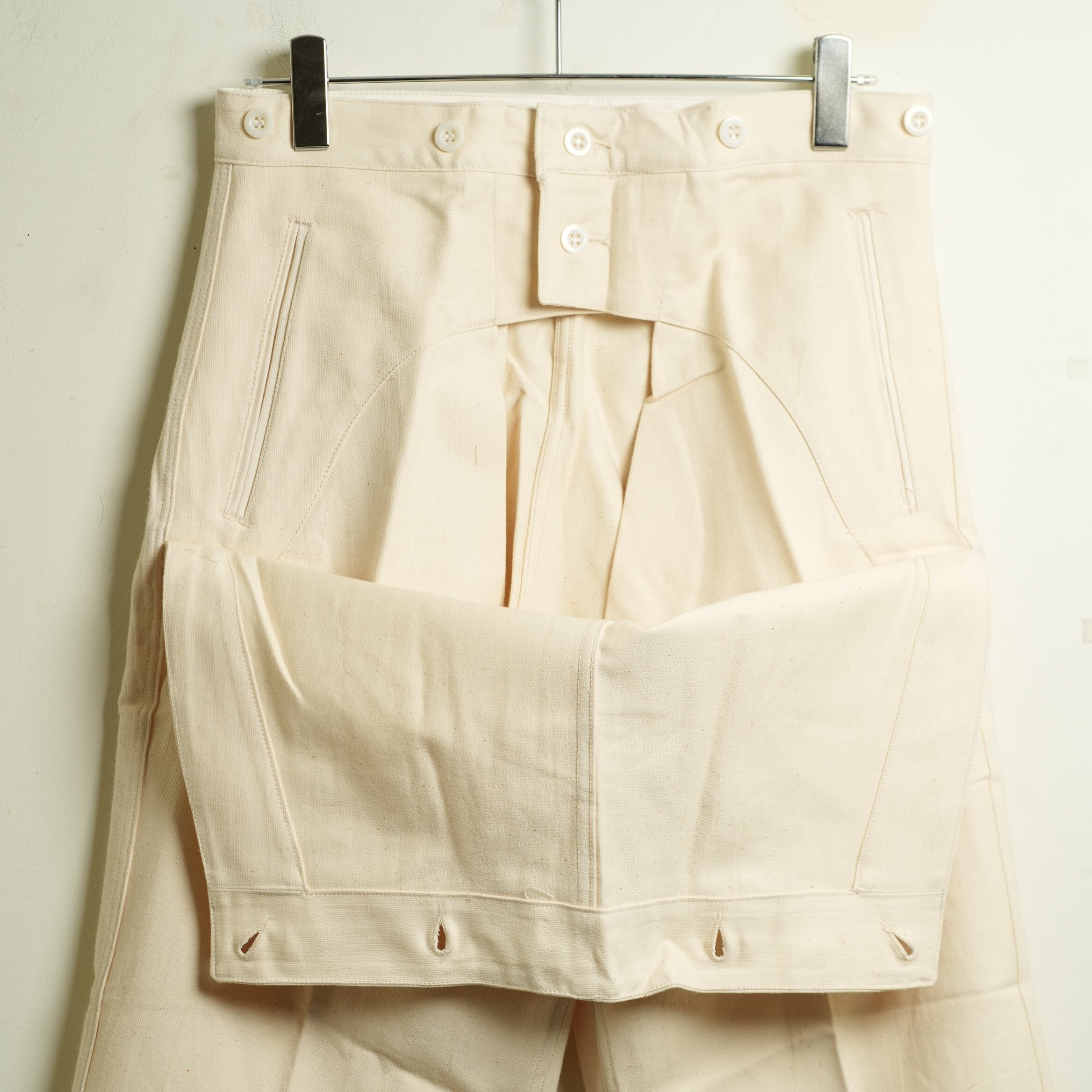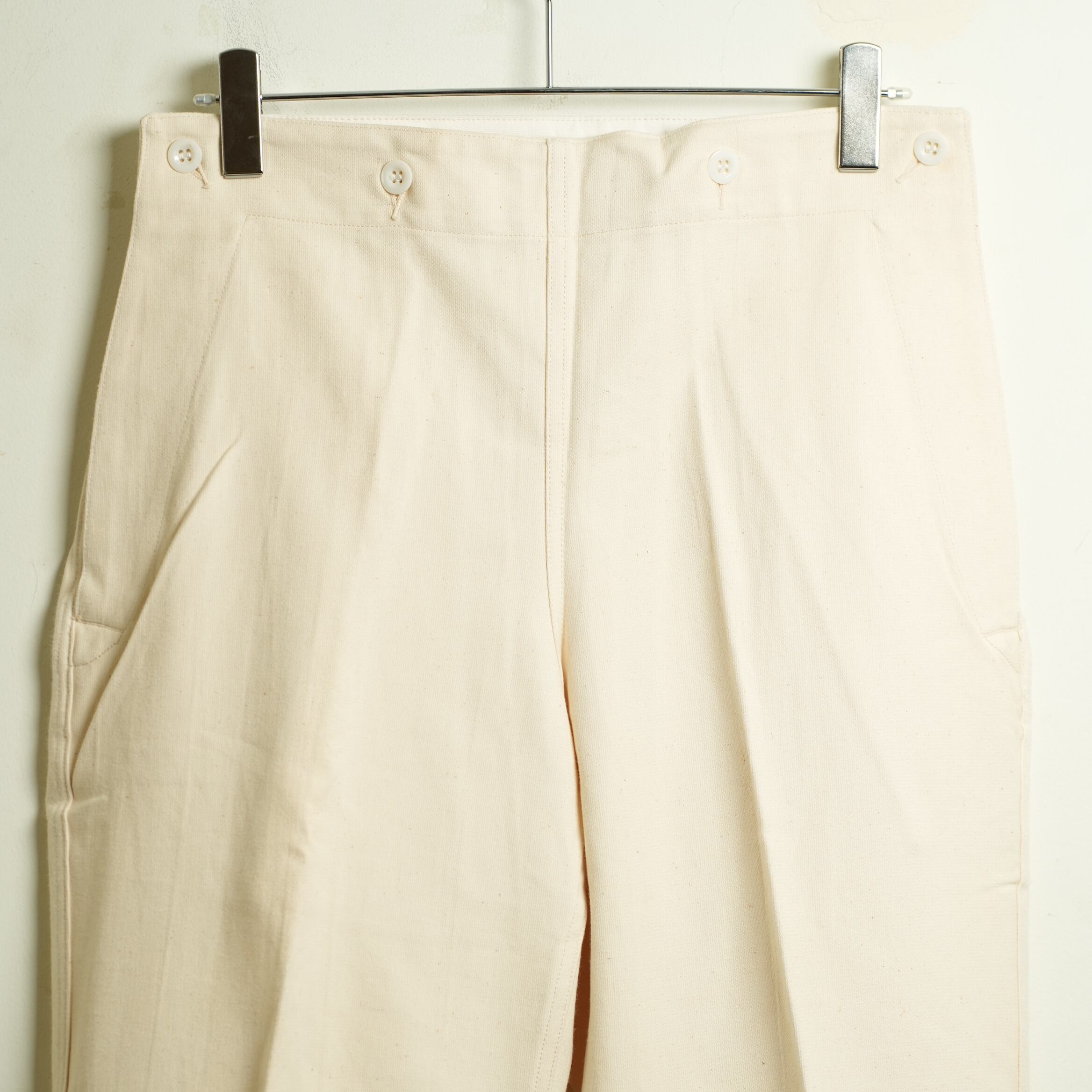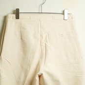 ドイツ海軍でデッキパンツとして採用されていたフロント部分がボタンで開閉する独特な雰囲気のパンツで、前あてのフラップの内側にサイドポケットが備わった特徴的なデザインです。