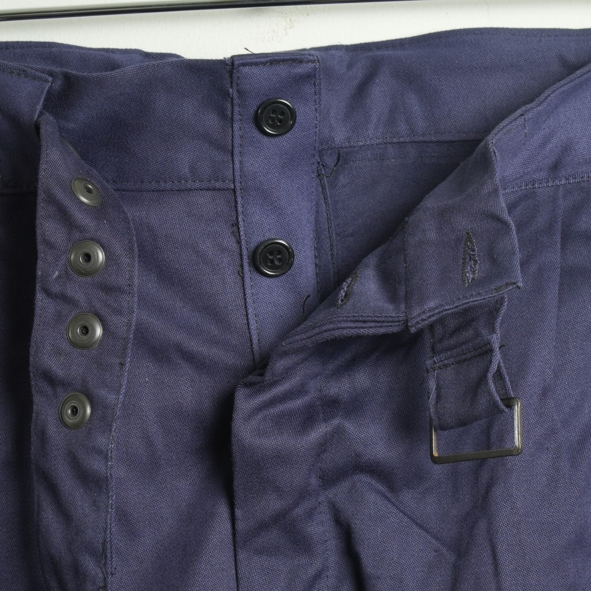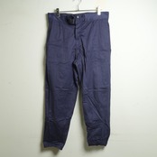 イタリア空軍のワークパンツです。独特な光沢感を持ち、ネイビーブルーのハリのある生地感です。品のある雰囲気を醸し出しており、最高にクールなワークパンツとなっています。裾はゴムシャーリングで伸縮し、綺麗なシルエットでスニーカーなどにも合わせやすいです。ウエストには調節可能なベルトが付いていて約10cmは絞れます。ワンタック仕様で腰回りに程よい余裕を持たせてあり、股部分にあしらわれたガゼットクロッチがパンツの可動域を広げますので実用的なワークパンツのデザインになっています。