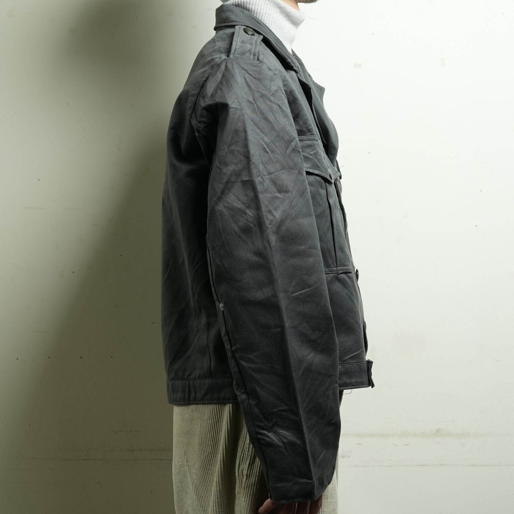 落ち着いたグレーの色目の素材は肉厚なコットンサテンを使用しており、ドーム型の刻印入りのボタンは金属製で鈍い光沢が雰囲気の良い質感です。