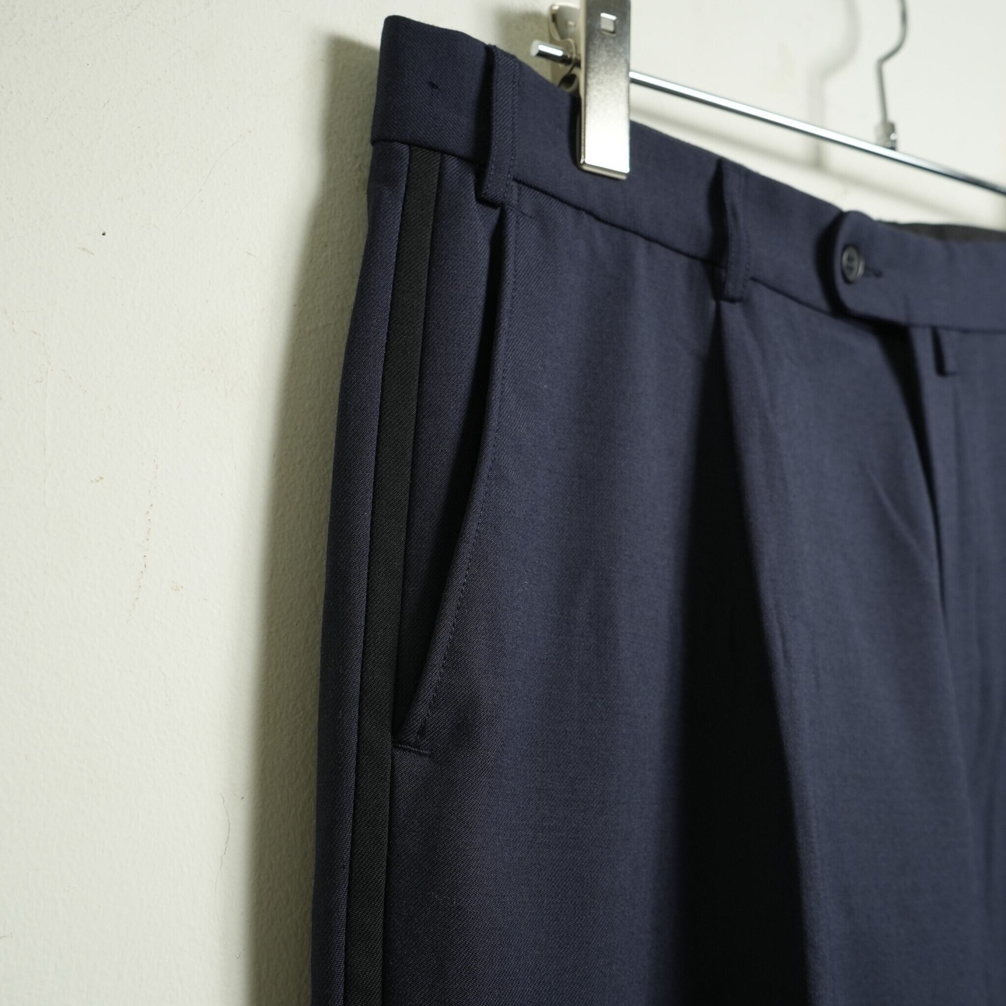 両サイドにラインが入ったデザインで、両サイドはブラック色のラインです。フロントはジッパーフライと一番上はフックとボタン留め、前はセンタープレスが入って、ワンタックで腰回りやヒップにゆとりがあります。
