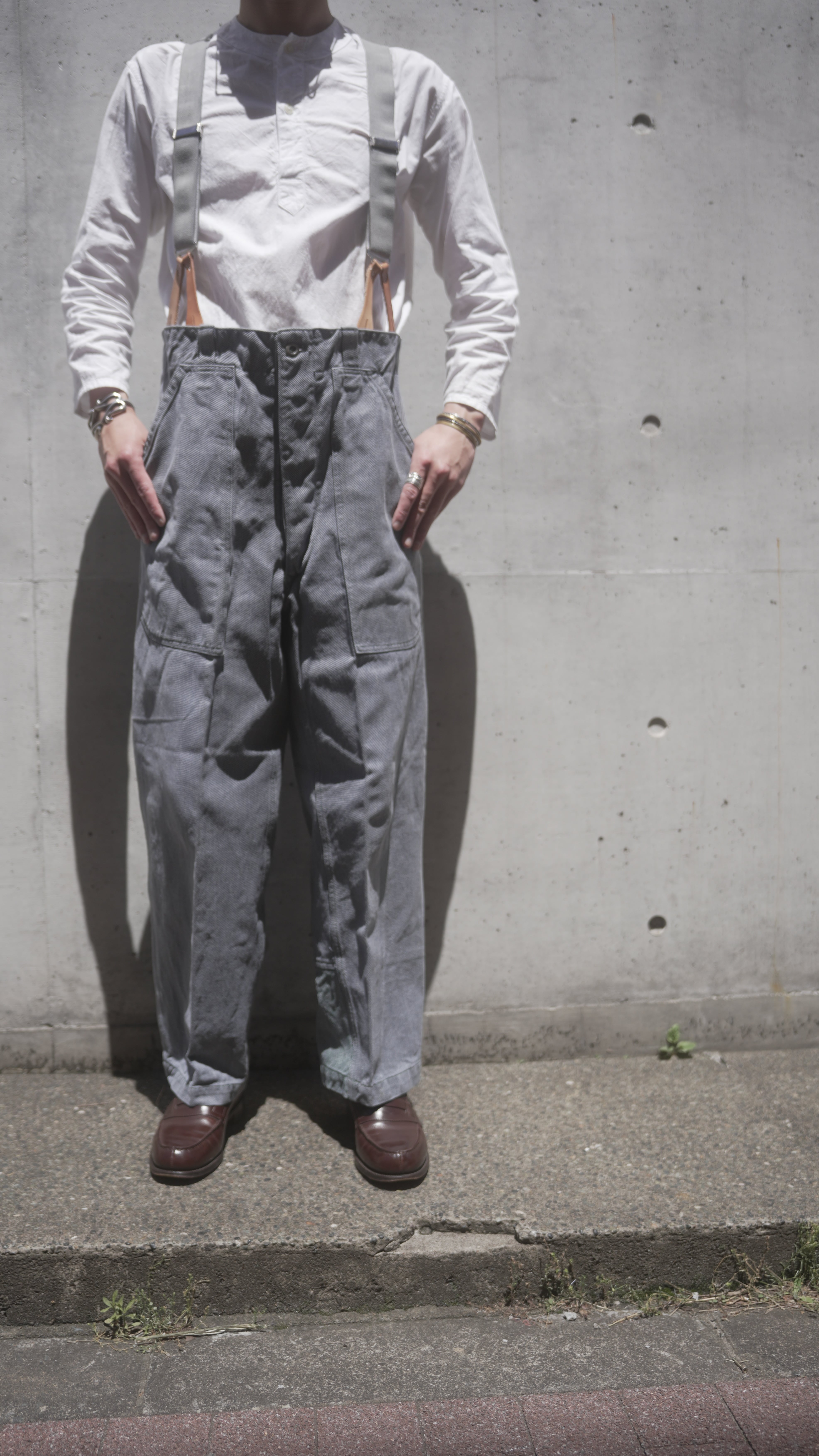 一般兵がセットアップでユニフォームとして着用されるアイテムですが、使い勝手がよく堅牢なヘビーオンスのデニムは、脇にスケールポケットが備わっていることもあり、作業服や囚人服としても着用されていたと言われています。 長い期間で採用されていたパンツですが、その中でも球数が少ないアルミニウムボタン仕様は希少価値の面でも魅力的な一本です。