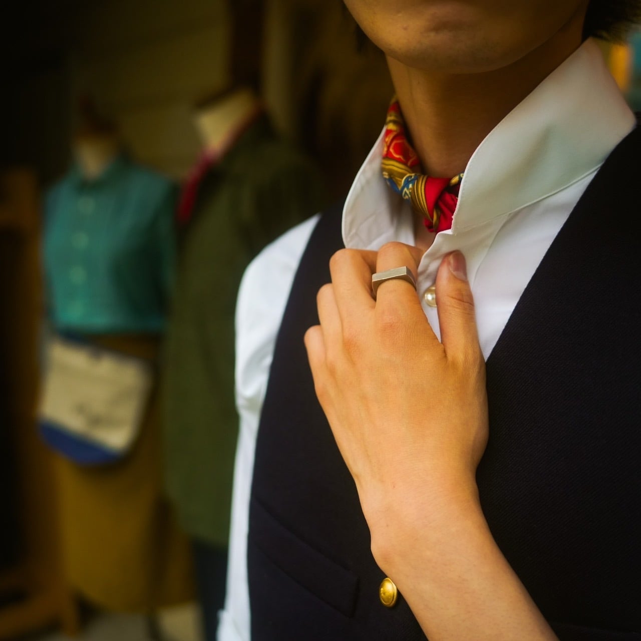 襟を折り返してボタンを開けて着用すると、丸みのある襟が柔らかな印象を与え、違った着こなしも可能です。