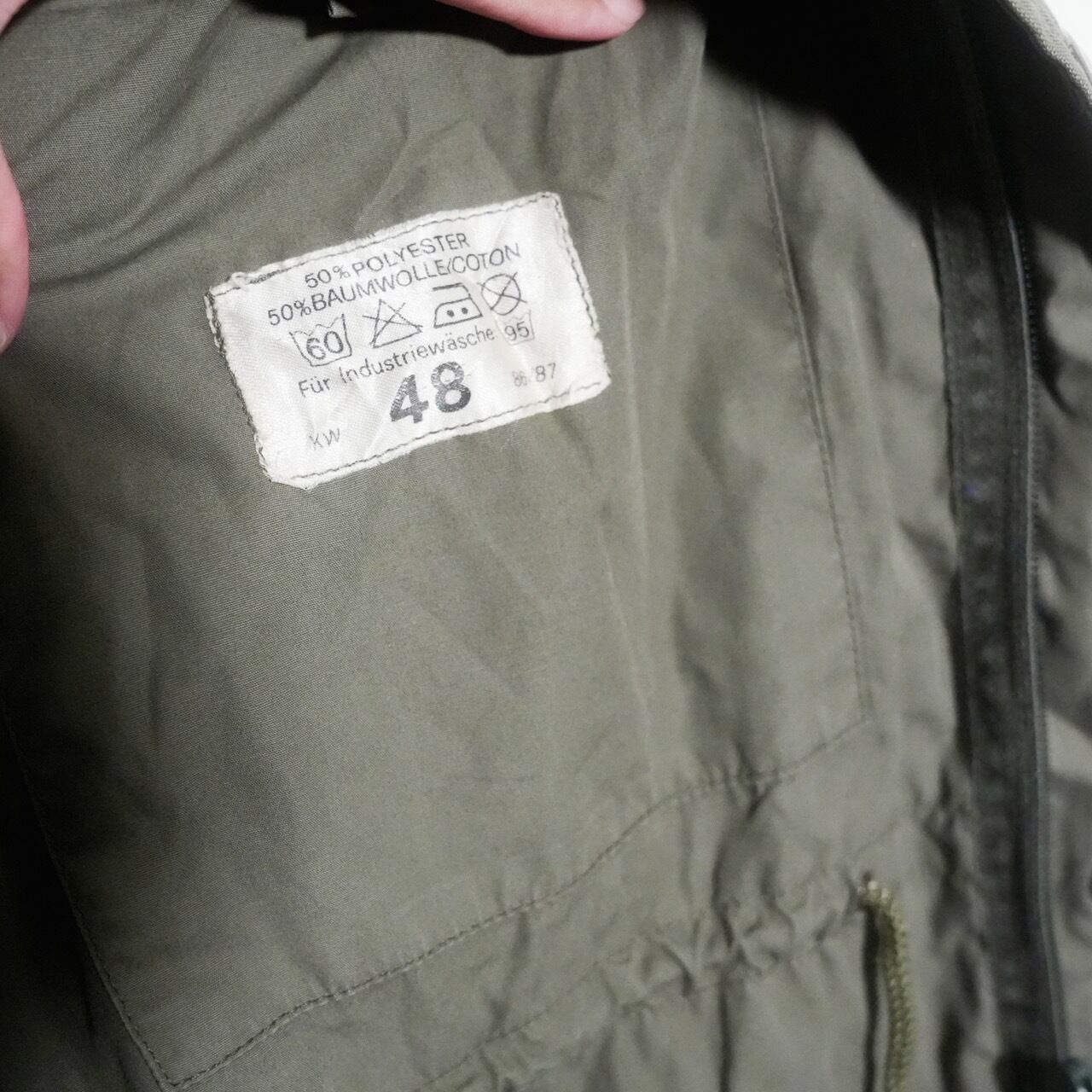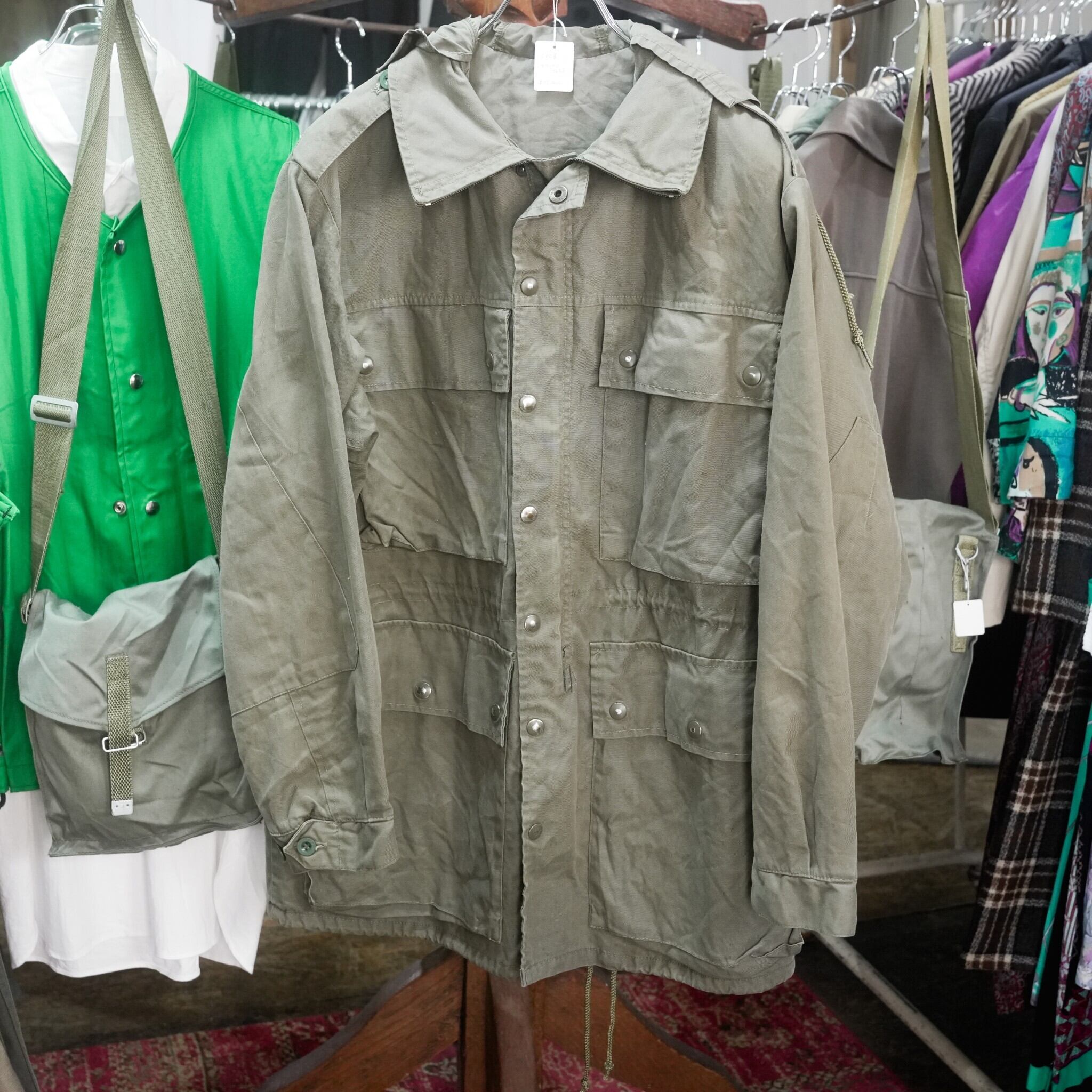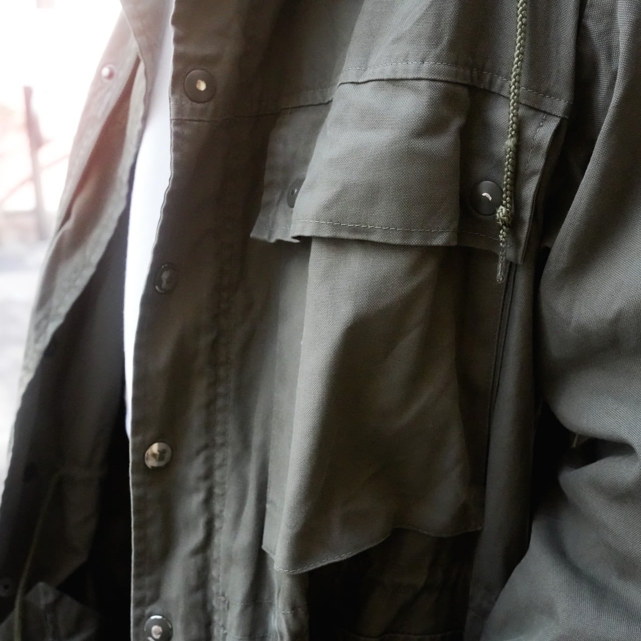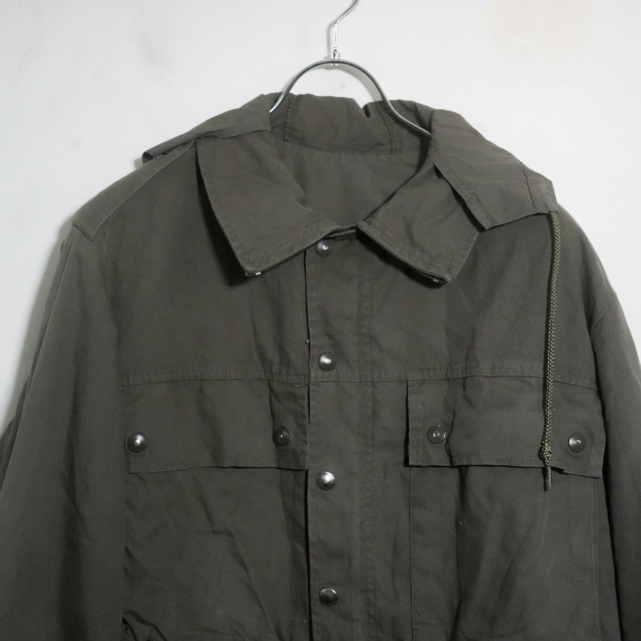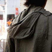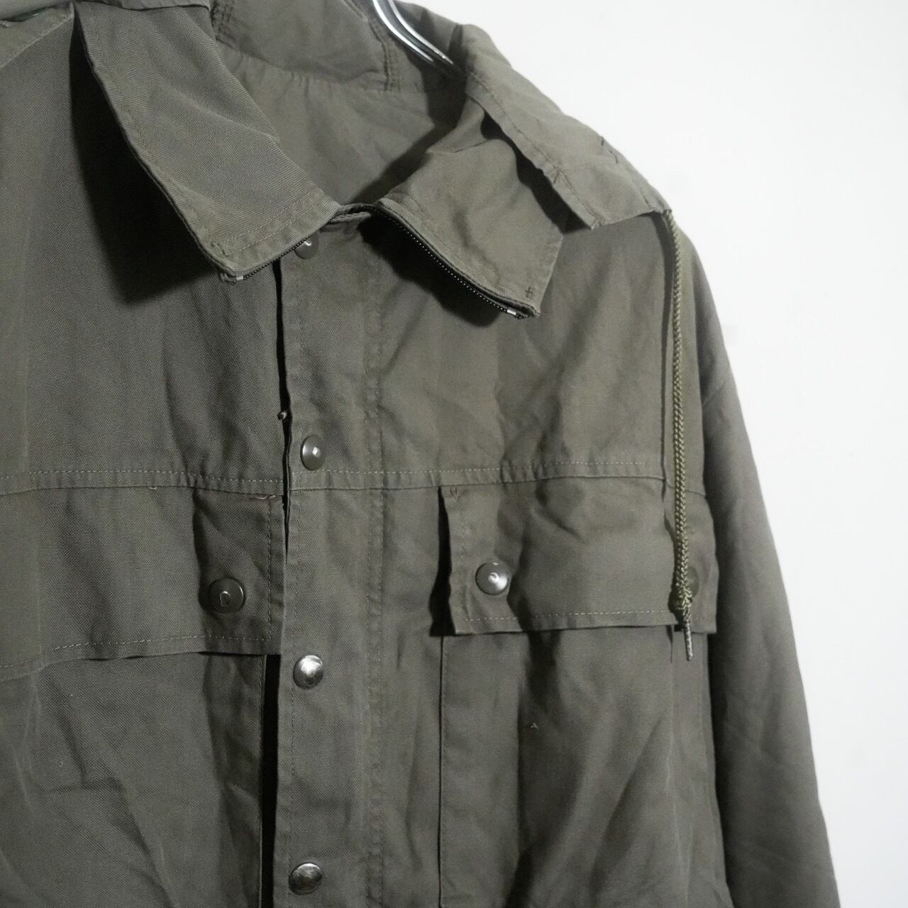 スイス軍の山岳部隊が使用していたマウンテンジャケットです。70〜80年代の物で生地はオリーブグレーカラーのポリコットン素材です。内側にはサラッとした薄手の裏地が付いています。フロント開閉はジッパーとスナップボタンの二重構造。襟は立てて上までジッパーを閉めることができます。フロントに配置された4つの大きなポケットに加え、内側にもポケットが3つあり収納力高めです。その他、内側の右裾に付いている小さなポケットは包帯収納用です。フードは使わない時は内側に入れるだけの簡単な仕様で、本体裏地と同じ薄い生地の簡易フードとなっています。フード、ウエスト、裾は紐で絞ることが可能です。