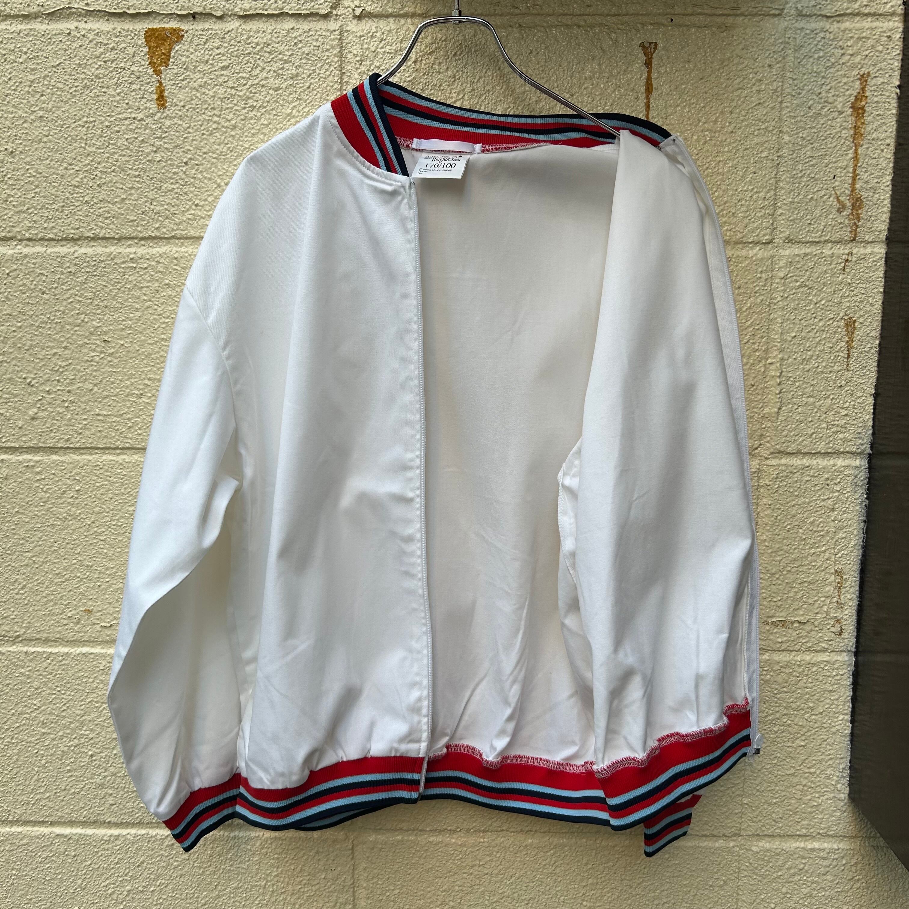 清潔感のあるホワイトカラーにマルティニカラーを連想させるネイビー、サックス、レッドという好配色のリブが使用された、スタイリッシュなデザインのトレーニングジャケットです。