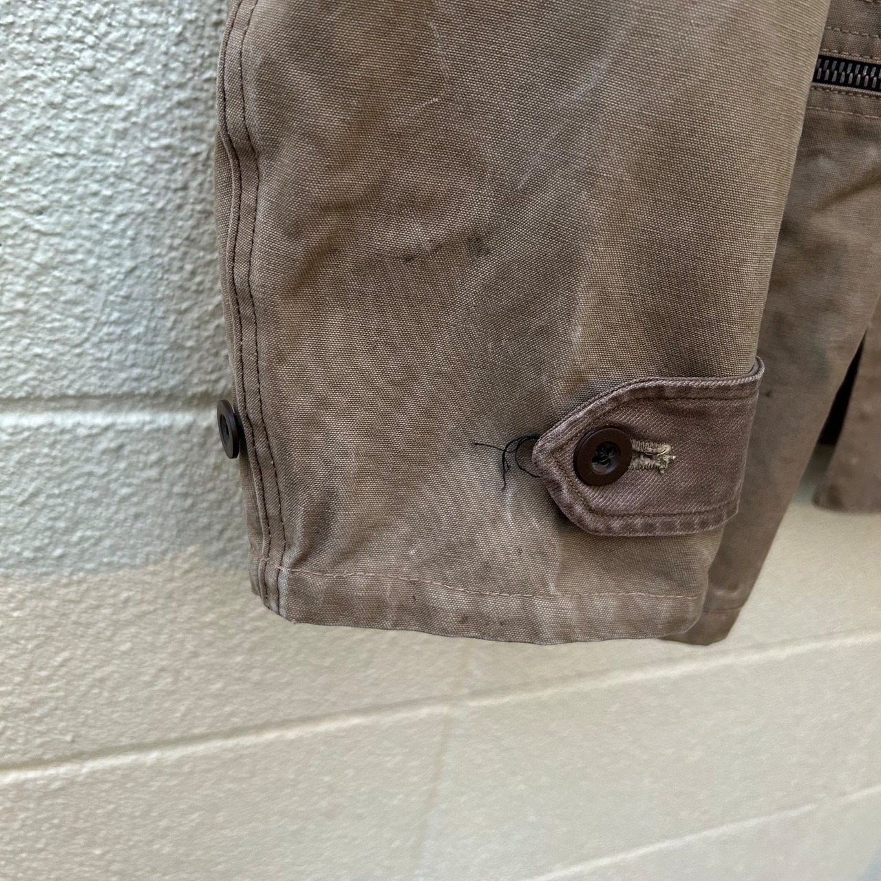 背中には内側のジッパーと繋がっている大きめのゲームポケット仕様、また全体的に施された長年の使用に伴うリアルなエイジングも素晴らしく、風格を備えた1着です。